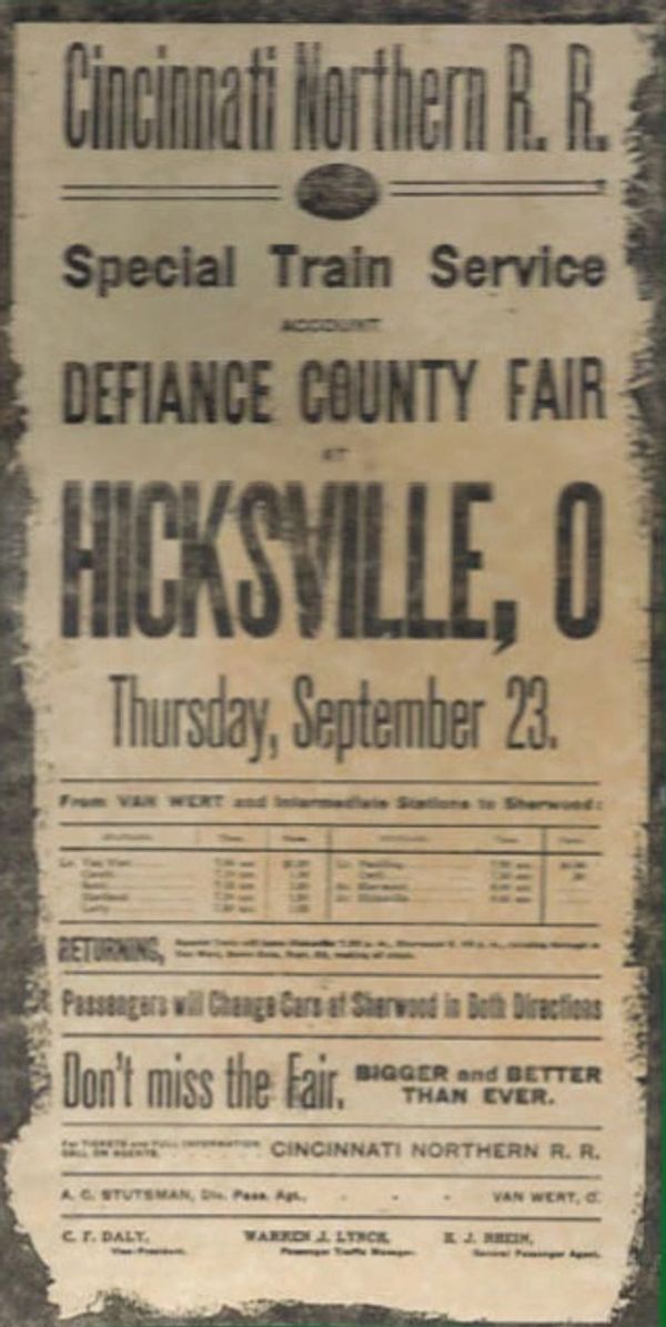 A. P. offered them a proposition they could not refuse! He told the railroad board, “If you will deflect the proposed route ten degrees to the southwest, and go through a town called Hicksville, I will give you the land right of way through Defiance County.” The board agreed. Had they not, it is left to our imagination as to how much larger our community would have grown.